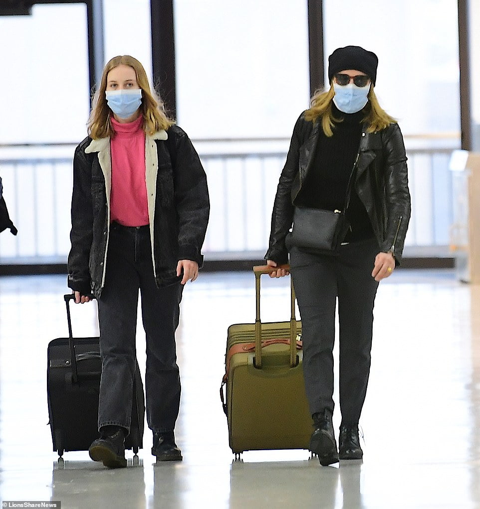 Felicity Huffman (proper), 56, and her oldest daughter Sophia Macy (left), 19, had been seen arriving at John F. Kennedy Airport in New York, New York, carrying blue face masks as fears of the coronavirus unfold
