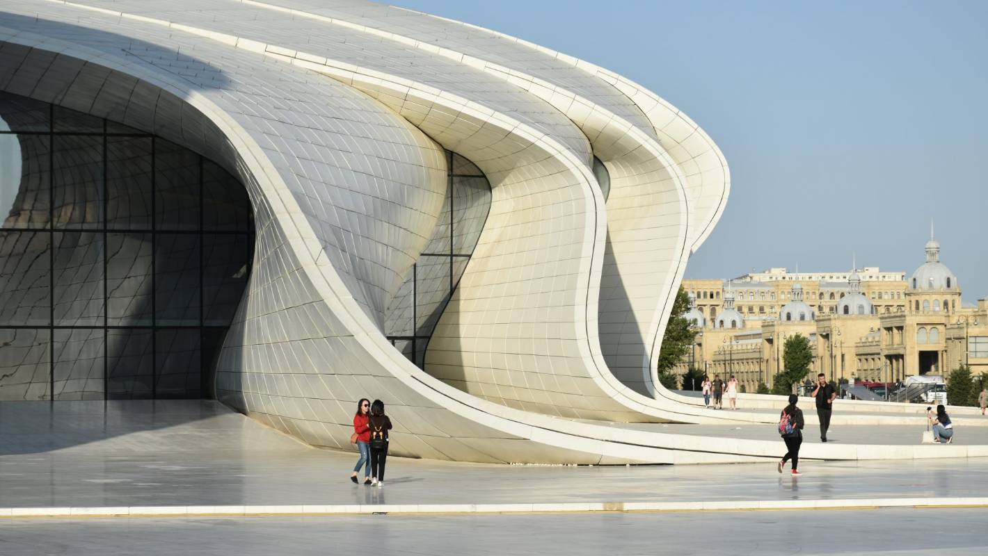 Locals and vacationers admiring an in depth up view of the Heydar Aliyev Cultural Centre.